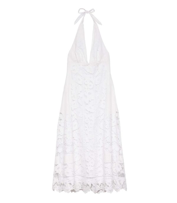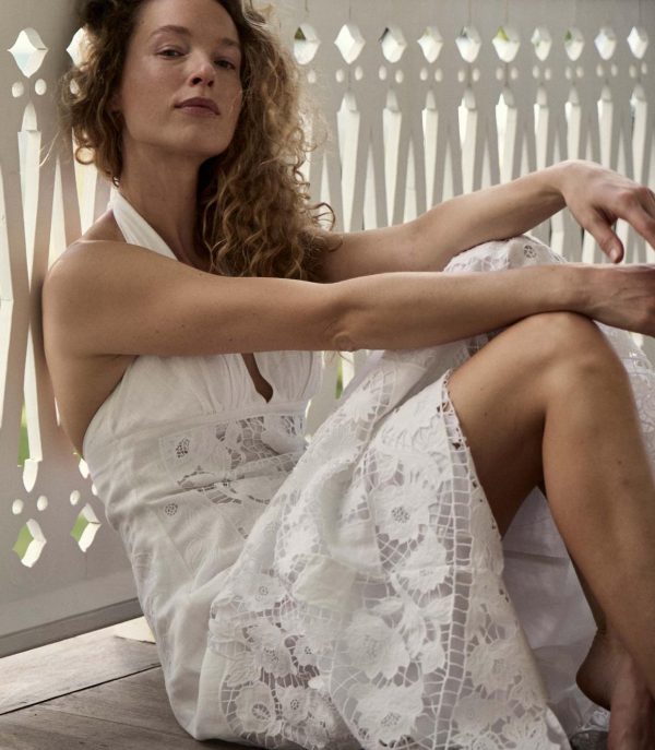 Tailored in a soft midweight linen, the DÔEN Heirloom Mariza Dress features a plunging halter V-neckline and an intricate floral embroidery cutwork design. A fitted waist with an invisible side zipper and a hook-and-eye closure gives way to an ankle-grazing A-line skirt.
