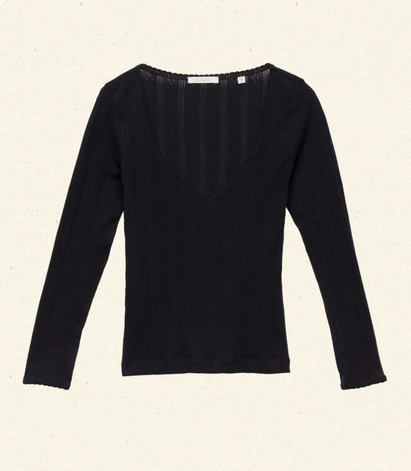 In the softest 100% organic cotton pointelle, the ‘90s-inspired Cilla Tee features a V-neck, full-length sleeves, and a fitted silhouette. Delicate lace detailing adorns the neckline and sleeve cuffs.